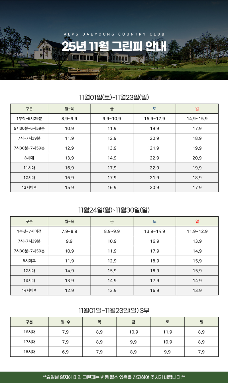 25년 11월 입장요금(그린피 안내)